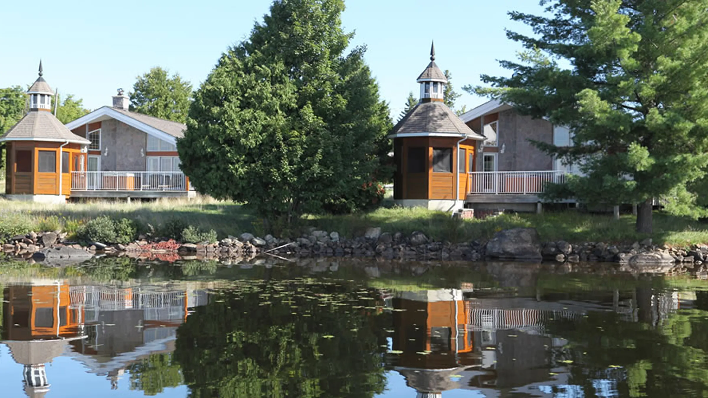Old European Boutique Chateaus and each with a Private Screened in Gazebo, Walkout Balcony and Outdoor Hot Tub to soothe life's pains away while enjoying views of spectacular scenery overlooking sparkling Galeairy Lake onto the romantic forests of Algonquin Park.